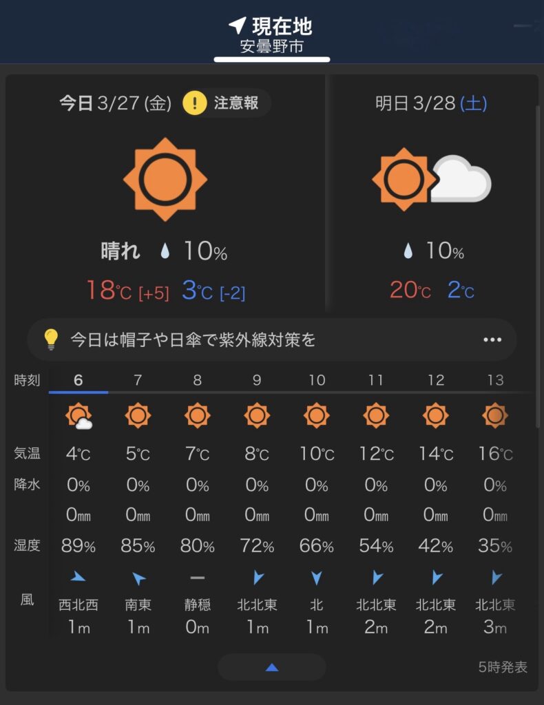 朝7時の塩尻市周辺は気温5℃〜7℃。しっかり冷え込んでおり、バッテリーも冷え切った状態でのスタートとなりました。