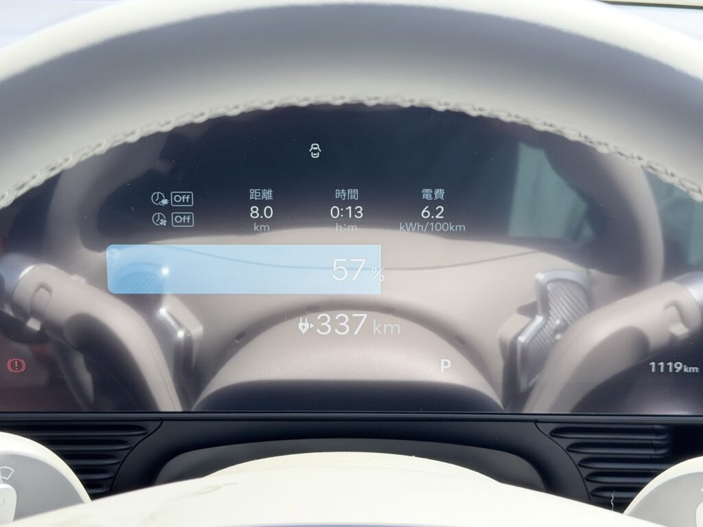 「そうなんです。しかもメーターの右下をよく見てください。8km走って到着したのに、バッテリー残量(SOC)は出発時と同じ『57%』のまま、1%も減っていないんです。」