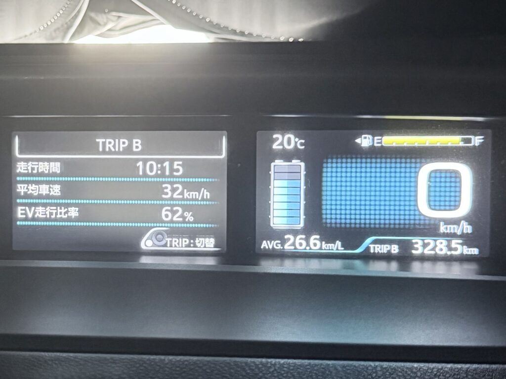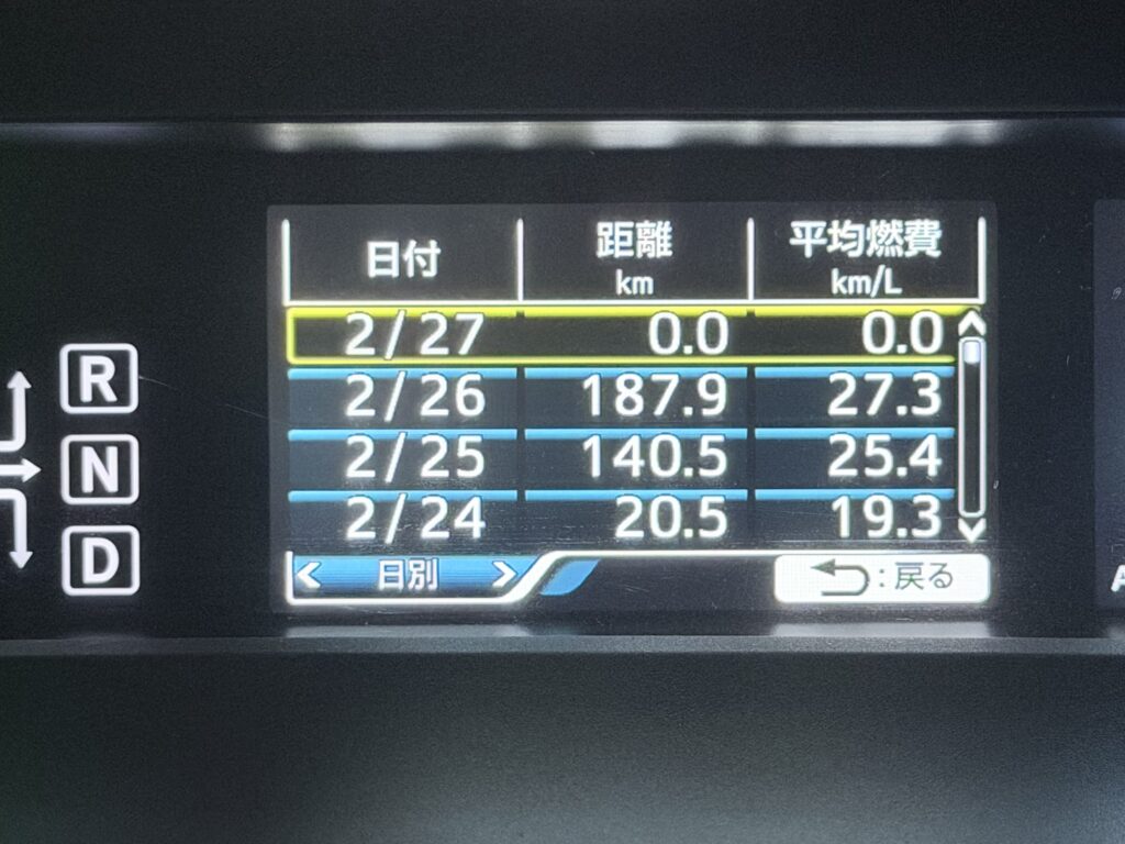 外気温が低く、雨天で路面抵抗も増え、さらに暖房とデフロスターを使用した状態での26km/Lという結果は、実用環境としては十分に優秀と言えます。